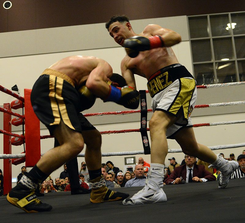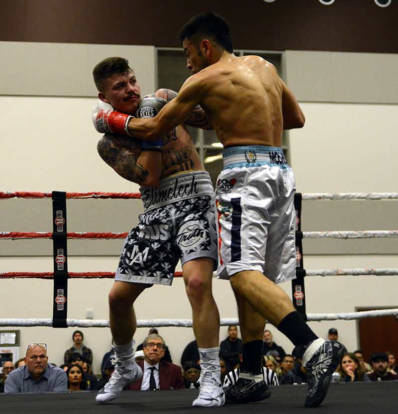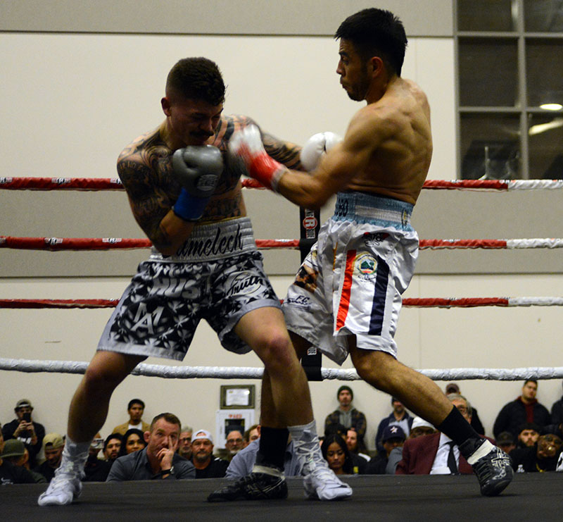 Keano Moyer and Robert Jimenez faced each other in Medford in June in a fight that though it ended in a majority draw, was claimed by many in attendance to be the fight of the night. The five round lightweight bout in Clackamas was an opportunity for one of the men to claim victory.As might be expected in a rematch, the opening round was close as both men looked to land scoring punches to gain an edge. Moyer threw most of his punches at Jimenez' body, while Jimenez proved to be an effective counter puncher as he landed scoring punches to Moyer's body and head. Jimenez opened the second round aggressively as he targeted Moyer's body and then slipped punches to his head. Jimenez landed a solid right hand that dropped Moyer at 2:20 of the round. Moyer stood and threw punches trying to answer Jimenez.Jimenez answered the bell to begin the third round with a flurry of punches that moved Moyer across the ring. Moyer, focused on not getting caught again, threw punches in return, but he was unable to land with any power. Jimenez landed a right hand to Moyer's body at the :30 mark that again dropped Moyer. While the referee counted, Moyer stood, but he was awkwardly holding his right arm.The referee waved an end to the fight, awarding the TKO win to Jimenez at the :40 mark of the third round. |