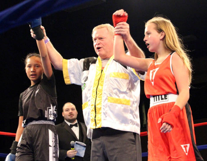 An amateur exhibition bout between two young ladies kicked off the festivities, as Abbi Reck, of Clarkston, Washington, took on Pine Ridge, South Dakota's Niyah Sierra at 110 lbs. Both boxers opened up early, swinging away with great effort, but it was Reck who appeared to land at a higher rate in the bout. No decision was rendered in the match-up. |