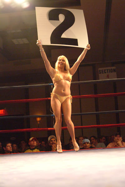 Everyone cheers for a ring card girl. |